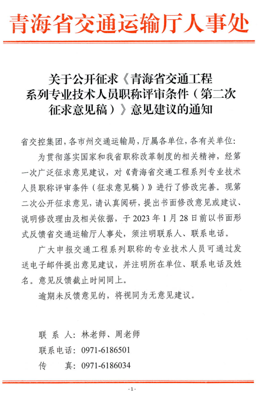 关于公开征求《青海省交通工程系列专业技术人员职称评审条件(第二次征求意见稿)》意见建议的通知