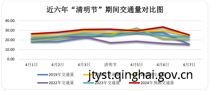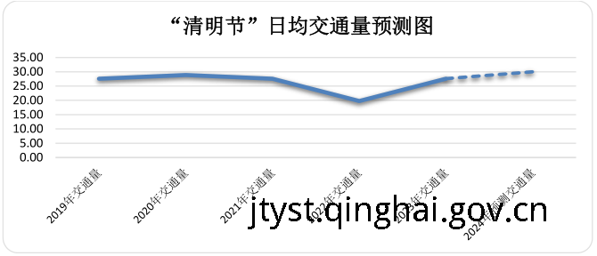 根据省公路局和省高速公路运营管理有限公司提供的历年数据分析,近三年“清明节”期间我省公路交通量呈增长趋势,交通量分布呈现“西宁周边大、海西青南地区小”的特征,其中交通量较大收费站分别为G6京藏高速海东主线收费站、西宁西主线收费站,G0612西和高速海东西主线收费站。2021年“清明节”期间日交通量为27.58万辆;2022年“清明节”期间日交通量为19.76万辆;2023年“清明节”期间日交通量为27.58万辆;2024年“清明节”预计交通量同比增加5%左右,达到30万辆/日。其中,高速公路实行小型客车免费通行政策,交通量较前后时段增加10%,4月4日(清明节)达到小峰值,约为31万辆,4月6日(假期第三日)下午通往西宁周边道路交通量可能出现高峰,4月7日(假期后一日)交通量将小幅回落。
