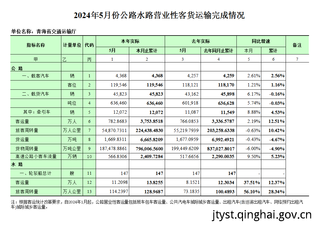 2024年1-5月公路水路营业性客货运输完成情况