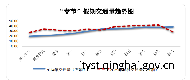 根据省公路局和省高速公路运营管理有限公司提供的历年数 据分析,近三年“春节”期间我省公路交通量呈增长趋势,交通量 分布呈现“西宁周边大、海西青南地区小”的特征, 其中交通量较 大收费站分别为 G6 京藏高速海东主线收费站、西宁西主线收费站, G0612 西和高速海东西主线收费站。2021 年“春节”期间日交通量 为 22.83 万辆;2022 年“春节”期间日交通量为 23.55 万辆;2023 年“春节”期间日交通量为 23.55 万辆;2024 年“春节”期间日交通 量为 32.70 万辆;2025 年“春节”(1 月 28 日-2 月 4 日)小长假 8 天,高速公路实行小型客车免费通行政策。预计交通量同比增加 10%左右,达到 36 万辆/日。1 月 27 日(腊月廿八)、1 月 28 日(除 夕)通往西宁道路交通量可能出现局部小高峰,随后交通量呈上升趋势,2 月 4 日(初七)西宁周边道路交通量可能出现小幅高峰, 2 月 5 日(初八)交通量将回落。高峰时段路网承压较重,尤其是在春节后返程的高峰时段,大流量路段将会出现明显的缓行拥堵。