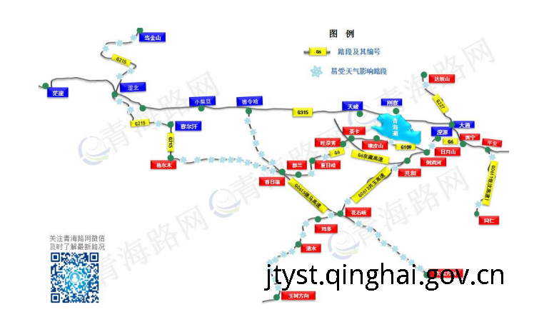根据近年数据分析,易受降雪路段主要集中在高海拔地区 G227 张孟线俄博段,G0613 西丽高速共玉段,G0615 德马高速花 久段。(详见下图)